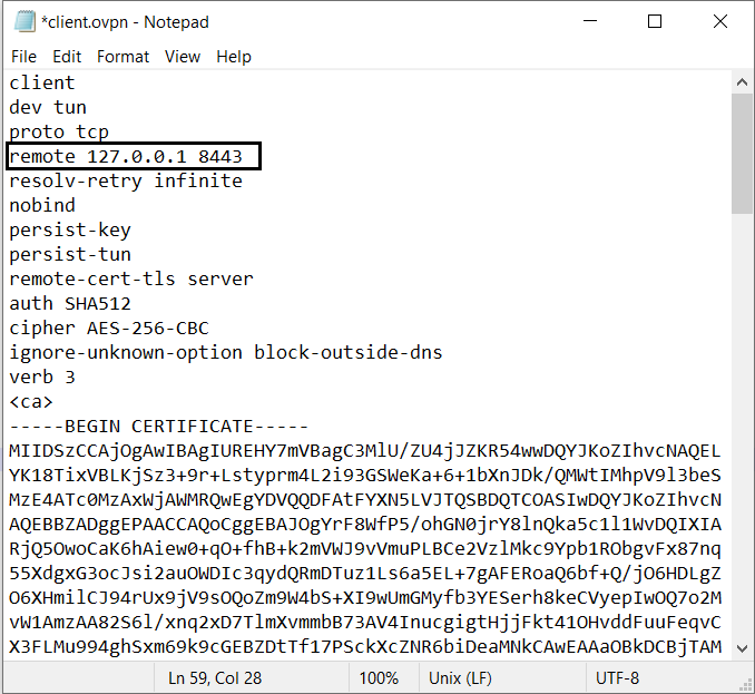When configuring OpenVPN Server, you might have downloaded, .ovpn file, that's the file you need to connect with the OpenVPN Server. But you need to do one modification to it. Sometimes it might have your VPS IP. In this case, we don't want to directly connect to the VPN. We need to connect through the Stunnel, then only it can wrap it using TLS/SSL Encryption. Therefore you need to edit the .ovpn file. Open .ovpn file with a text editor and replace the IP and the port you see in the remote parameter with 127.0.0.1 8443 (That's the listening IP and port in the Stunnel Client configuration).